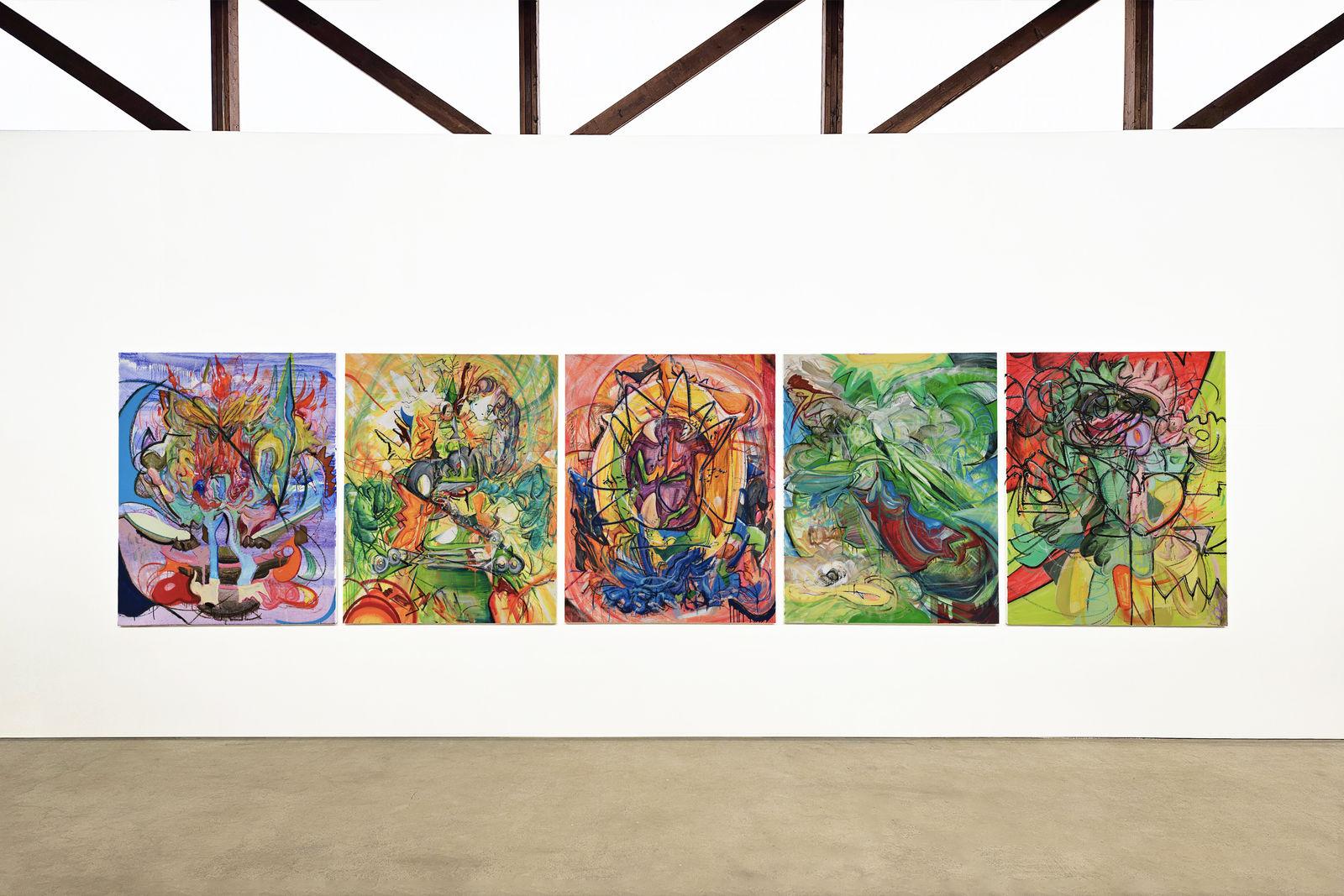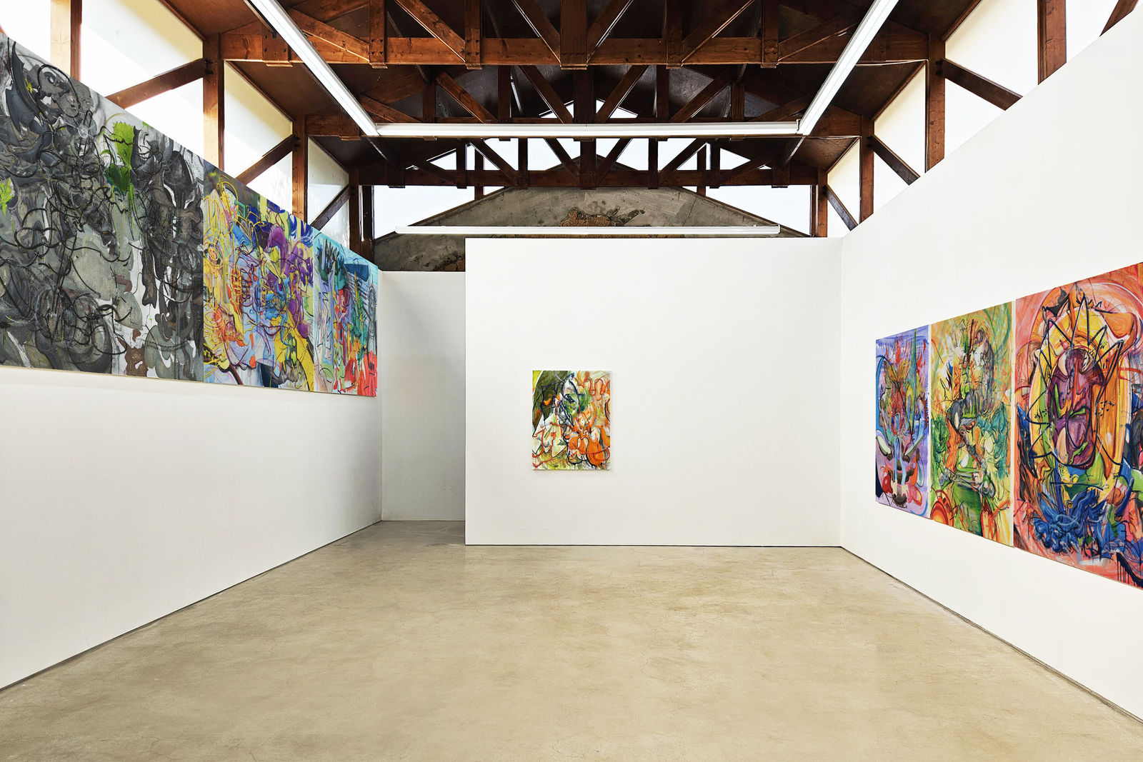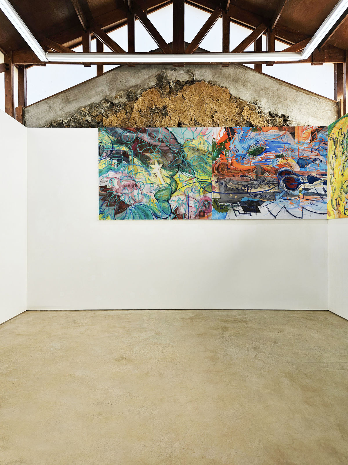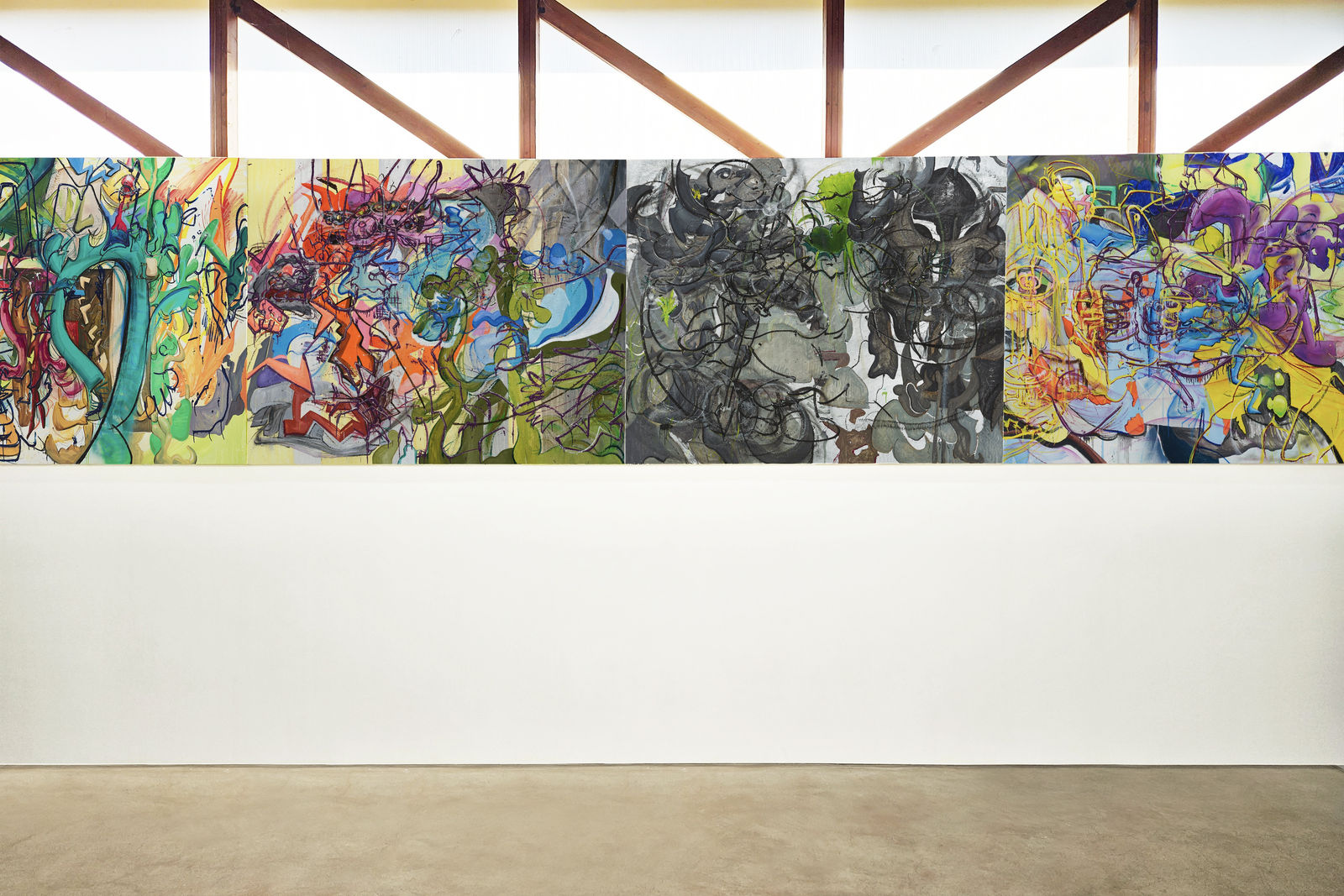 저는 자유롭고 거침없는 태도를 회화로 구현하고 싶었어요. 여기서 이야기하는 자유롭고 거침없는 태도는 제가 경험하고 좋아하는 ‘스트리트 문화’에 뿌리를 둔 것이죠. 예를 들면 내지르는 소리나 앰프를 찢는 듯한 사운드를 음악으로 만들어 내는 펑크 록, 레코드판을 긁어서 소리를 만드는 디제이의 스크래치, 다른 음악을 이어 붙여 새로운 음악을 만드는 힙합의 샘플링, 질서를 어지럽히고 선을 넘나드는 그래피티 같은 것들입니다. 이런 스트리트 문화가 만들어내는 분출하는 듯한 에너지를 회화의 에너지로 구현하는 것이 이번 전시의 목표입니다.