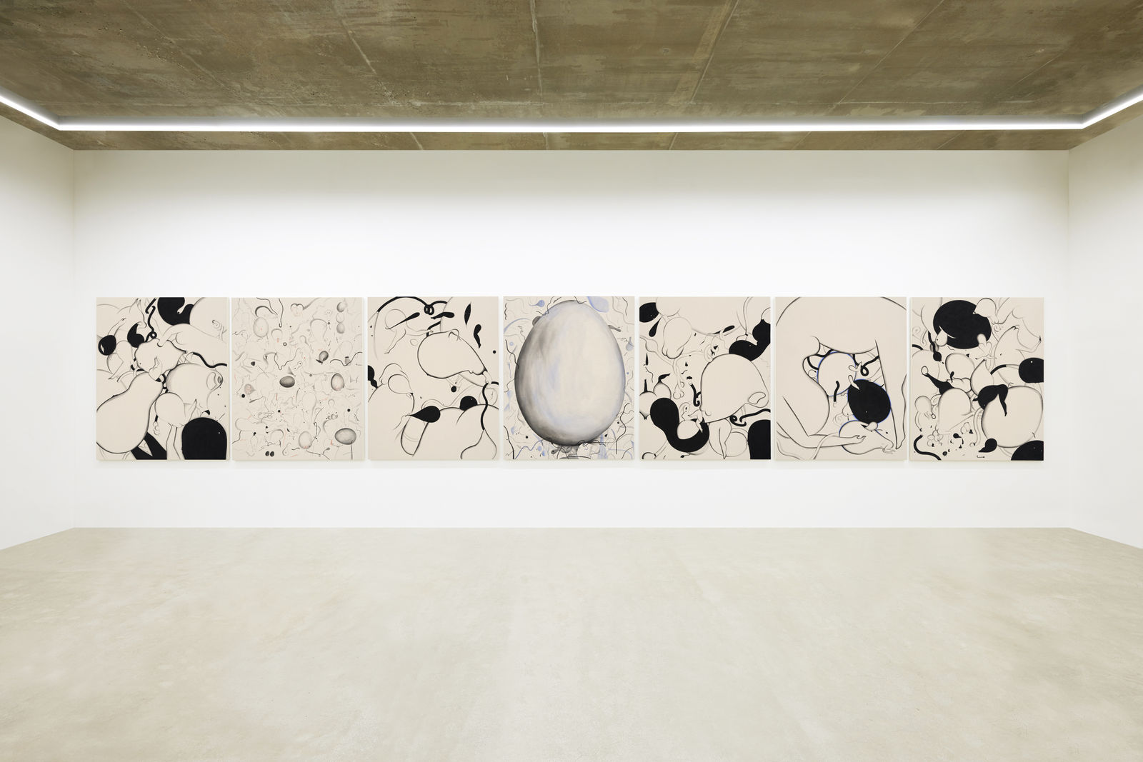 박주애는 도자기를 만들 듯 그림을 그렸다. 평소 도자기를 만들기 전에 드로잉을 먼저 제작한다고 한다. 평면(드로잉)에서 오브제(도자기) 그리고 다시 평면(그림)으로 돌아간 것이다. 그러니 이미지가 없었다면 오브제도 없었다. 처음에는 형상을 직관적으로 표현했지만, 작업을 진행하는 과정에서 임신에 대한 욕구와 불안함이 다소 옅어 지면서 형상은 은유적으로 변화한다. 추상화된 태아의 성장 과정, 탯줄, 난소, 난자, 여성의 몸이 그림의 요소가 되어 화면 위를 유영한다.