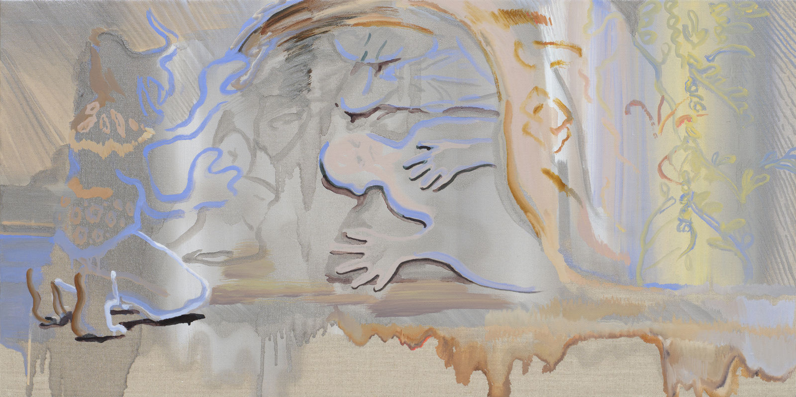 The No.300 canvas size (290cm wide) of <Mite life 1> is a mingling of Wonhyo’s skull-water experience and the artist’s own unfortunate swig. The other No.300 canvas work <Mite life 2> shows a skull placed like a 17th-century Dutch still life Vanitas. Both works feature skeletons, but context defines which is that of Wonhyo or of Vanitas. The two are unrelated, but the shared skull-object in each are interpreted variably. In <Pine-skull>, a female figure holds an object that appears to be something of a skull and a pineapple. Like an optical illusion of mundane objects, they possibly are loose and illusive allusions to Vanitas or Wonhyo. Works such as <Mite life 4> and <Still life with Tulips> are not still-lifes with intentional compositions. Rather, they are fleeting snapshots that quickly capture moments of objects and situations before they continue on their effervescence.
